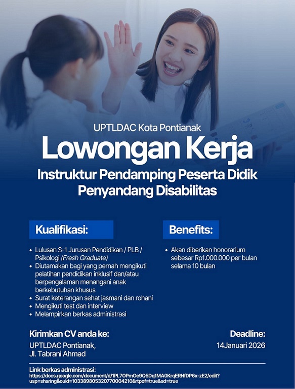 Dalam rangka mendukung penyelenggaraan Pendidikan Inklusif di Kota Pontianak maka kami bermaksud akan melakukan penerimaan tenaga Insruktur Pendamping Peserta Didik Penyandang Disabilitas (Shadowteacher) yang akan ditempatkan di beberapa Satuan Pendidikan jenjang Sekolah Dasar Negeri (ditentukan kemudian).