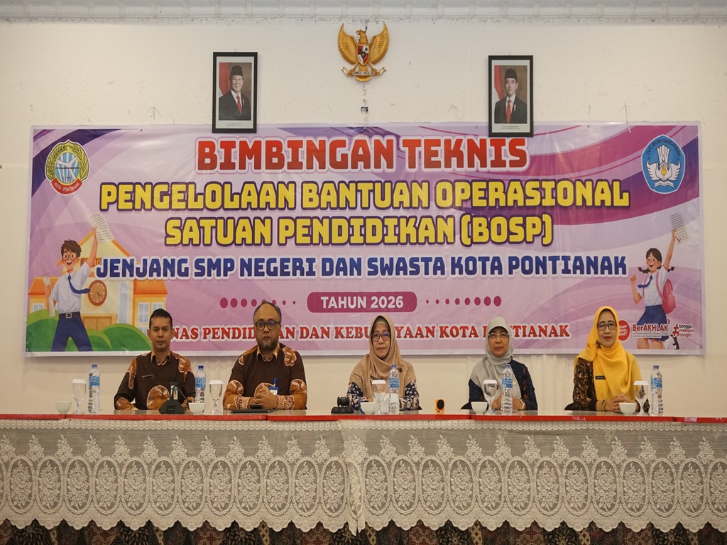 Dinas Pendidikan Kota Pontianak melaksanakan Kegiatan Bimbingan Teknis Pengelolaan Bantuan Operasional Satuan Pendidikan (BOSP) Jenjang SMP Negeri dan Swasta se-Kota Pontianak Kamis, 5 Februari Tahun 2026.